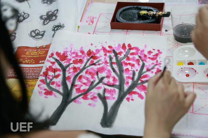Sau các buổi học thắt nút, cắt giấy, võ thuật, sinh viên UEF tiếp tục được trải nghiệm nghệ thuật vẽ tranh thủy mặc vào chiều 22/5. Đây là hoạt động trong chương trình du học online Trung Quốc do Khoa Ngôn ngữ và Văn hóa quốc tế kết hợp với Đại học Dân tộc Quảng Tây tổ chức.