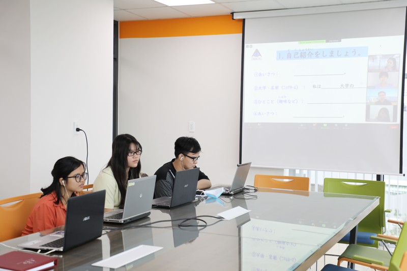 Đợt 3 diễn ra vào sáng nay (9/9). Lớp học được dẫn dắt bởi cô Seko - Trưởng bộ môn giảng dạy tiếng Nhật của trường KIU. Ở buổi học này, sinh viên UEF có trình độ tương đương trung cấp trở lên được học tập trực tuyến cùng với các bạn đến từ Thái Lan và Nhật Bản. Với hình thức học tập qua tranh ảnh, trao đổi trực tiếp bằng tiếng Nhật, sinh viên UEF có thể kết nối, tương tác cùng với giảng viên và cả bạn bè quốc tế. Cạnh đó, sinh viên cũng được trực tiếp đặt câu hỏi với giảng viên KIU và được giải đáp tận tình.