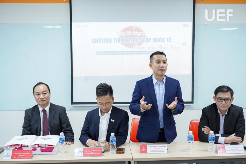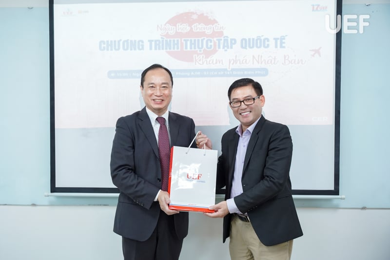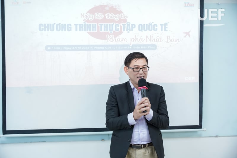 Mở đầu chương trình, TS. Nhan Cẩm Trí đã cùng các bạn sinh viên điểm lại những giá trị to lớn mà chương trình thực tập quốc tế mang lại. Thầy chia sẻ: “Là một trường đại học áp dụng mô hình đào tạo quốc tế, việc tạo điều kiện cho sinh viên có cơ hội thực tập và làm việc tại các doanh nghiệp nước ngoài luôn là một trong những mục tiêu quan trọng và dài hạn của UEF. Tham gia vào những chương trình này, các bạn không chỉ học hỏi và phát triển toàn diện mà còn có cơ hội tiếp thu văn hóa, kiến thức và kinh nghiệm quý giá, đồng thời rèn luyện tư duy ngôn ngữ. Hơn nữa, việc thực tập có lương còn khẳng định giá trị của mỗi cá nhân mà sinh viên đã đạt được”.