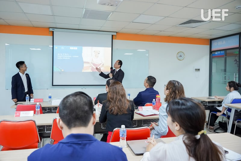 Tiếp đến, đại diện doanh nghiệp đã chia sẻ về chương trình thực tập trong ngành nhà hàng, khách sạn và resort tại Nhật Bản. Ông Nakayama Ken cho biết, sinh viên UEF đã để lại nhiều ấn tượng tốt với các doanh nghiệp Nhật Bản nhờ vào sự chuyên nghiệp và tinh thần cầu tiến. Khả năng giao tiếp hiệu quả, sự nhanh nhẹn trong việc thích nghi với môi trường làm việc, cùng với kiến thức chuyên môn vững vàng đã giúp các bạn chiếm được lòng tin từ các nhà tuyển dụng. Nhiều doanh nghiệp đánh giá cao sự chủ động, sáng tạo và lòng nhiệt huyết của sinh viên UEF, cho thấy các bạn là nguồn nhân lực có giá trị cho các công ty hàng đầu tại Nhật Bản.