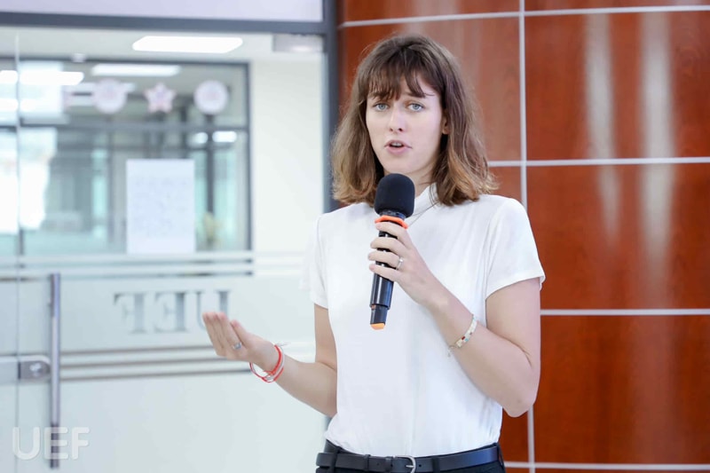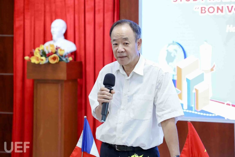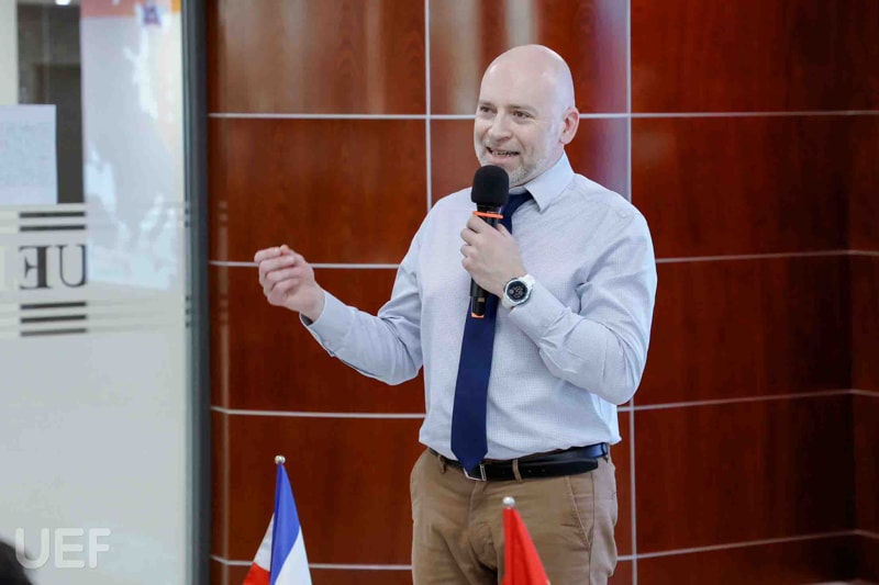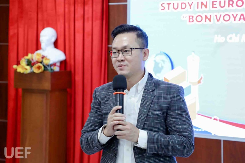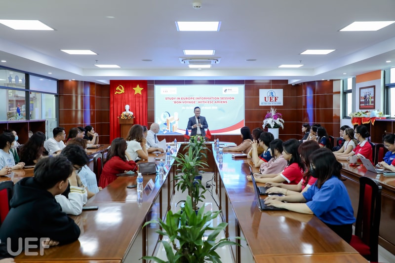 Chia sẻ trong chương trình, ông Yann Tournesac đã trình bày về một số thông tin liên quan đến môi trường học tập tại Châu Âu nói chung và tại Pháp nói riêng; kỹ năng mềm để toàn cầu hóa và du học; và quan trọng nhất là mối quan hệ hợp tác song phương mới được thiết lập giữa UEF và ESC Amiens School of Management cho chương trình liên kết chuyển tiếp du học 3+1 với trường Đại học Quản trị Amiens (ESC Amiens School of Management).