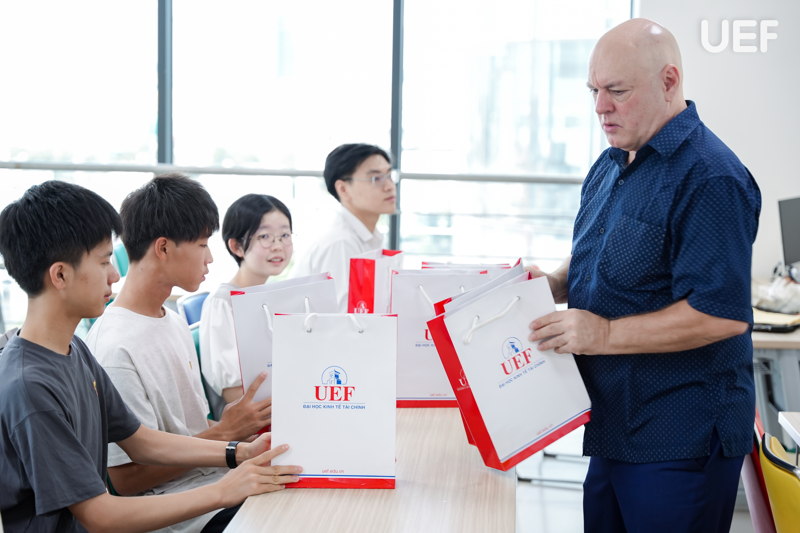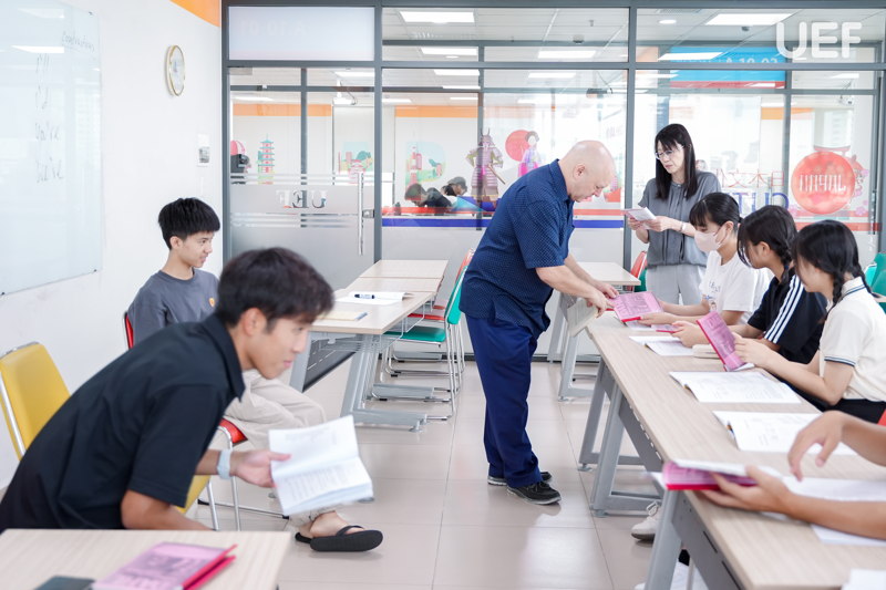 Khóa học “English Communication Program for Japanese Students” diễn ra từ ngày 11 đến 14/8/2025, với 20 giờ học trực tiếp tại UEF. Giảng viên phụ trách là thầy Dillin David Graham - chuyên gia Ngôn ngữ học Ứng dụng đến từ Hoa Kỳ, giàu kinh nghiệm giảng dạy và là giám khảo IELTS. Chương trình tập trung rèn luyện kỹ năng nghe - nói, cải thiện phát âm, ngữ điệu và mở rộng vốn từ thông dụng, thông qua các hoạt động thảo luận nhóm, trò chơi vai và mô phỏng tình huống thực tế.