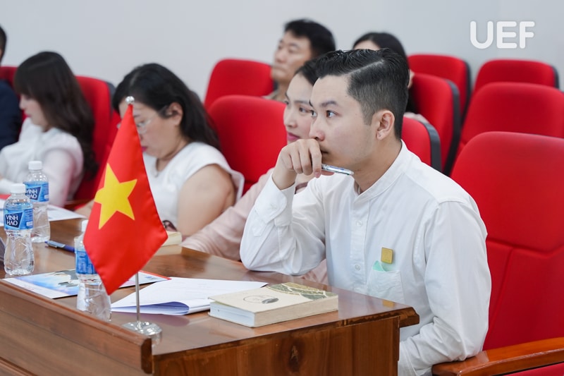 Đại diện UEF tham dự chương trình có TS. Nhan Cẩm Trí - Phó Hiệu trưởng, ThS. Phạm Thị Thùy Linh - Phó Trưởng Khoa Ngôn ngữ và Văn hóa quốc tế và TS. Bùi Thị Mỹ Linh - Trưởng ngành Ngôn ngữ Hàn Quốc cùng đại diện lãnh đạo, giảng viên, nhân viên các đơn vị. Về phía khách mời có ông Cho Young Cheol - Giám đốc Quỹ Hợp tác Khởi nghiệp, Đại học Quốc gia Chungbuk.