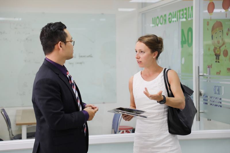 Sau buổi chia sẻ cùng sinh viên, cô Carys Mai Hughes tiếp tục tham quan, tìm hiểu môi trường quốc tế tại UEF