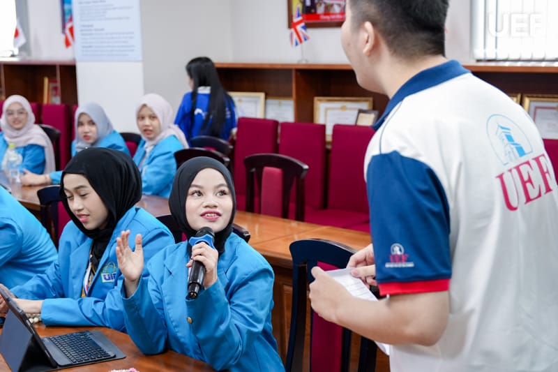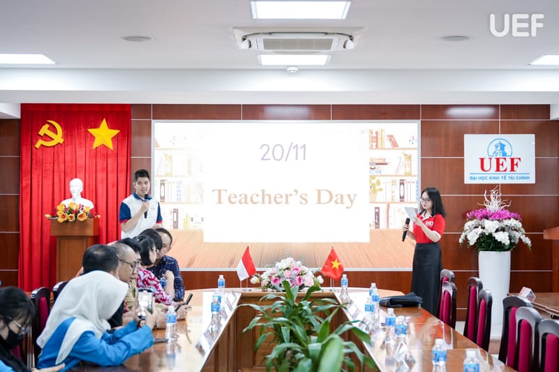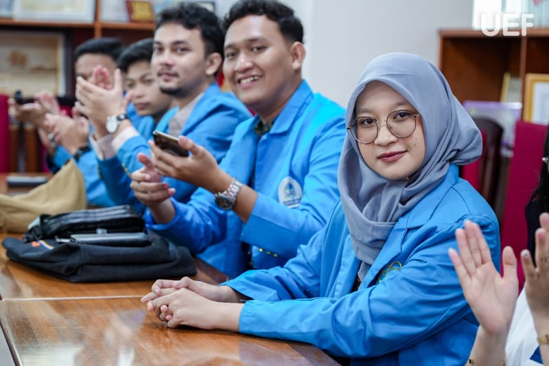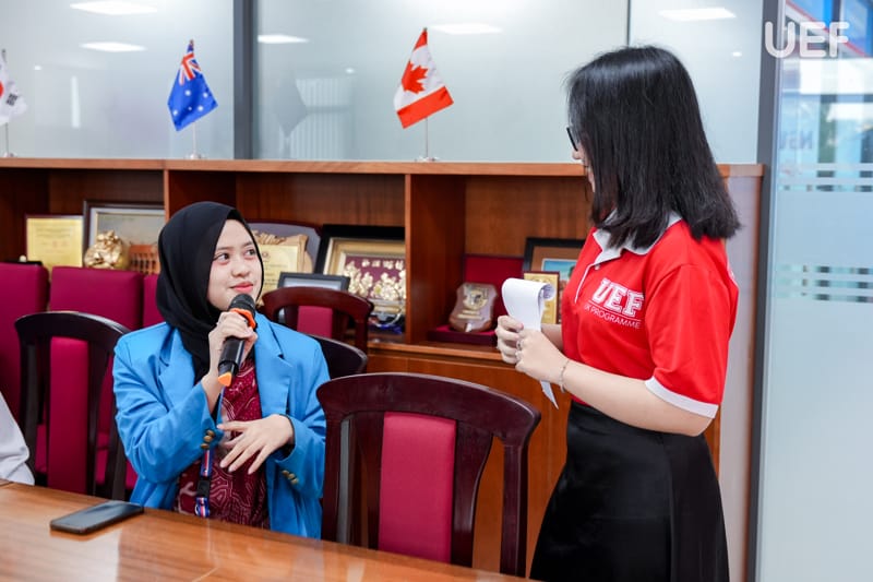 Tại buổi chào đón, sinh viên UEF đã mang đến những nội dung giới thiệu gần gũi và sinh động về văn hóa Việt Nam như Ngày Nhà giáo Việt Nam 20/11, Tết Nguyên đán, cùng nhiều câu chuyện thú vị về ẩm thực và danh lam thắng cảnh. Những chia sẻ này không chỉ giúp sinh viên Indonesia hiểu thêm về văn hóa Việt Nam mà còn tạo nên bầu không khí giao lưu đa sắc màu, trẻ trung và đầy nhiệt huyết.