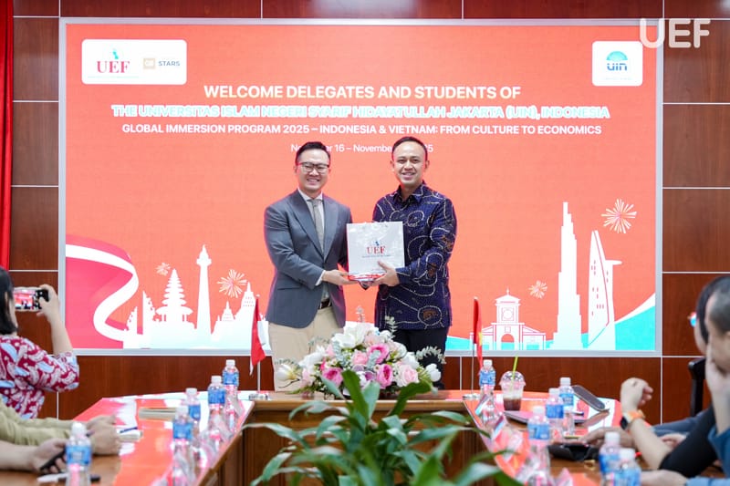 Sáng ngày 17/11, UEF đã chào đón đoàn giảng viên, sinh viên từ Universitas Islam Negeri Syarif Hidayatullah Jakarta (UIN), Indonesia trong khuôn khổ chương trình “Global Immersion Program 2025 - Indonesia & Vietnam: From Culture to Economics”. Buổi gặp gỡ mở đầu cho hành trình giao lưu học thuật, văn hóa đầy ý nghĩa giữa sinh viên hai quốc gia.