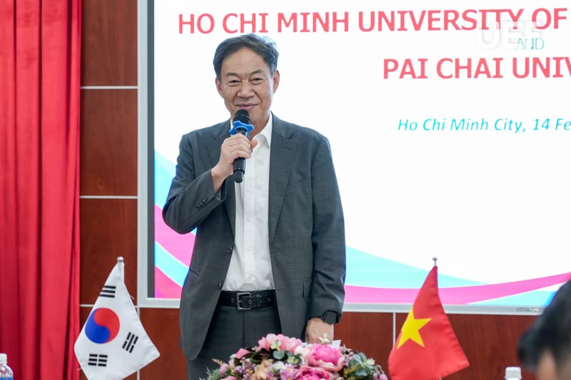 Trước khi thực hiện nghi thức ký kết, TS. Nhan Cẩm Trí đã giới thiệu tổng quan về UEF và nhấn mạnh những điểm nổi bật của chương trình quốc tế hợp tác với các trường đại học tại Hàn Quốc. Đồng thời, thầy bày tỏ hy vọng về mối quan hệ bền chặt với Đại học Pai Chai, cùng triển khai nhiều chương trình chất lượng cho sinh viên hai trường.