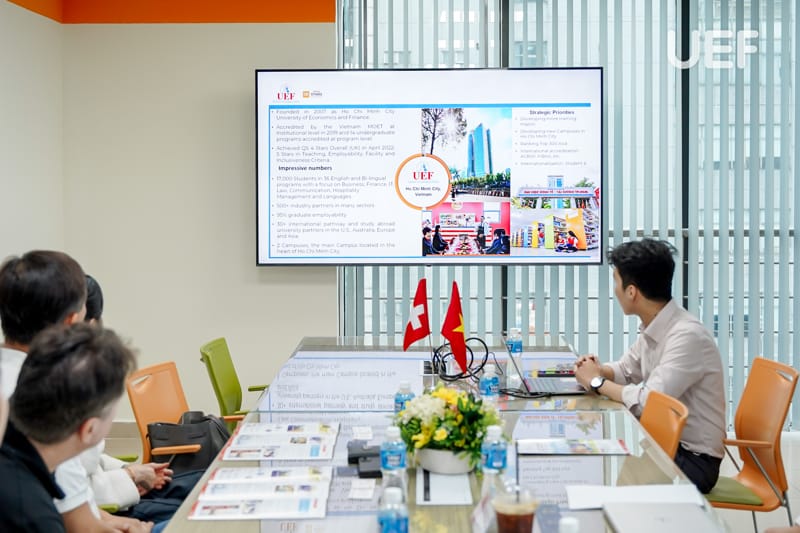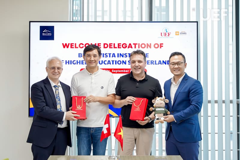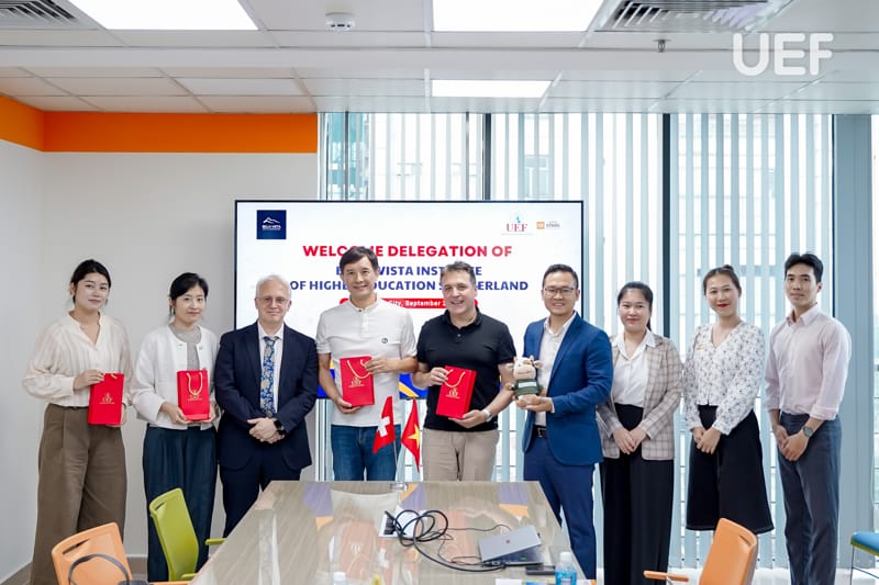 Vào ngày 24/9 vừa qua, UEF đã đón tiếp và làm việc với lãnh đạo Bella Vista Institute Switzerland (BVIS), một cơ sở giáo dục tư nhân tại Thụy Sĩ cung cấp các khóa học ngắn hạn cho sinh viên. Tại buổi làm việc, hai bên đã trao đổi về cơ hội hợp tác triển khai các chương trình học tập quốc tế.