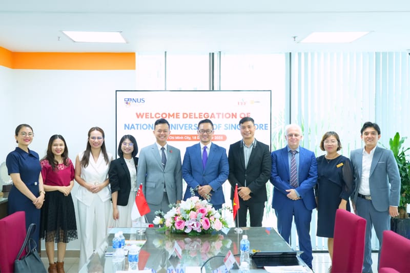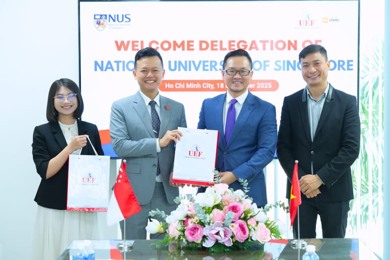 Sáng ngày 18/12, UEF đã tiếp đón và làm việc với đại diện Đại học Quốc gia Singapore (National University of Singapore - NUS) nhằm trao đổi kinh nghiệm và tìm hiểu mô hình đào tạo khởi nghiệp cho sinh viên. Buổi làm việc thể hiện mong muốn tăng cường kết nối học thuật và mở rộng cơ hội phát triển cho sinh viên trong lĩnh vực khởi nghiệp và đổi mới sáng tạo.