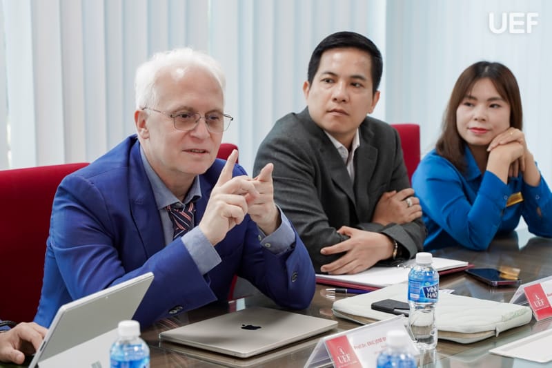 Tham dự buổi làm việc, về phía UEF có TS. Đỗ Hữu Nguyên Lộc - Phó Hiệu trưởng; GS.TS. Eric Jose Olmedo Panal - Viện trưởng Viện Quốc tế; PGS.TS. Phạm Huy Cường - Trưởng khoa Tiếng Anh; PGS.TS. Dương Mỹ Thẩm - Phó Trưởng khoa Tiếng Anh; TS. Nguyễn Kim Thoa - Phó Viện trưởng Viện Quốc tế. Về phía đoàn quốc tế có Mr. Mark Ryen Anderson - Director of the English Language Training Center và Ms. Thanh Thu - Sales and Marketing Manager, International Department.