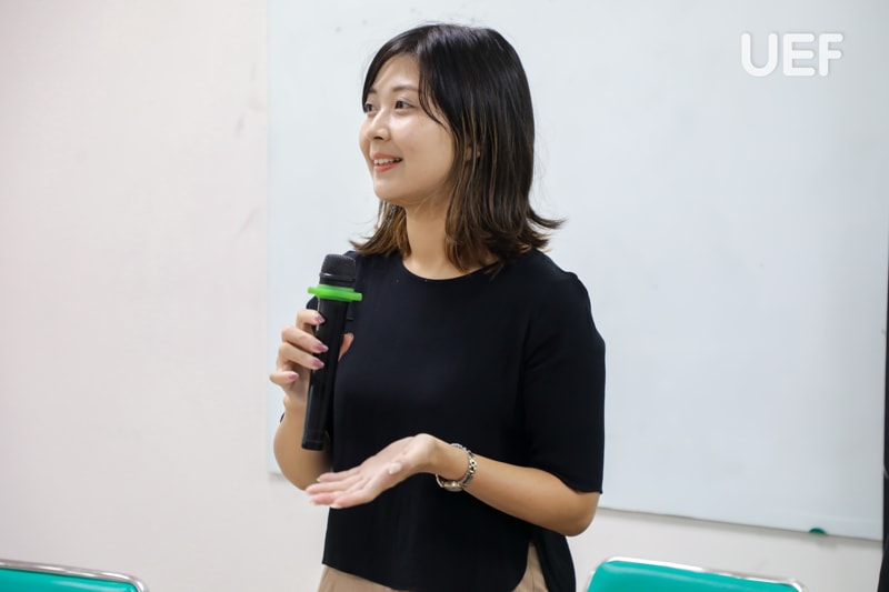 ThS. Nguyễn Trần Vũ Thư giữ vai trò phiên dịch để thông tin được truyền tải hiệu quả đến UEFers