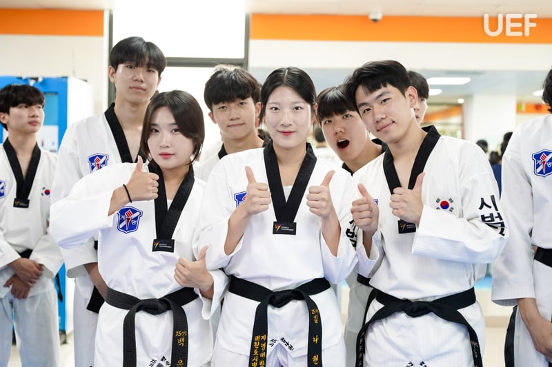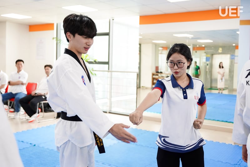Ngay sau đó, các bạn sinh viên UEF được xem những màn trình diễn võ thuật đẹp mắt đến từ đội tuyển Taekwondo của trường đại học Keimyung. Các tiết mục đã được chuẩn bị và dày công luyện tập để có thể mang đến những động tác dứt khoát và mạnh mẽ, quảng bá sâu rộng nét văn hóa võ thuật đặc trưng của Hàn Quốc đến bạn bè quốc tế.