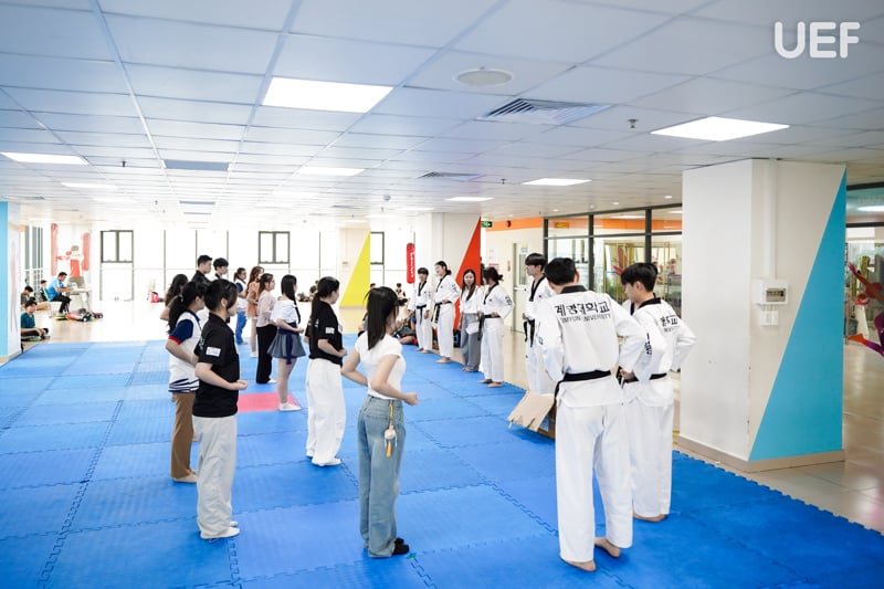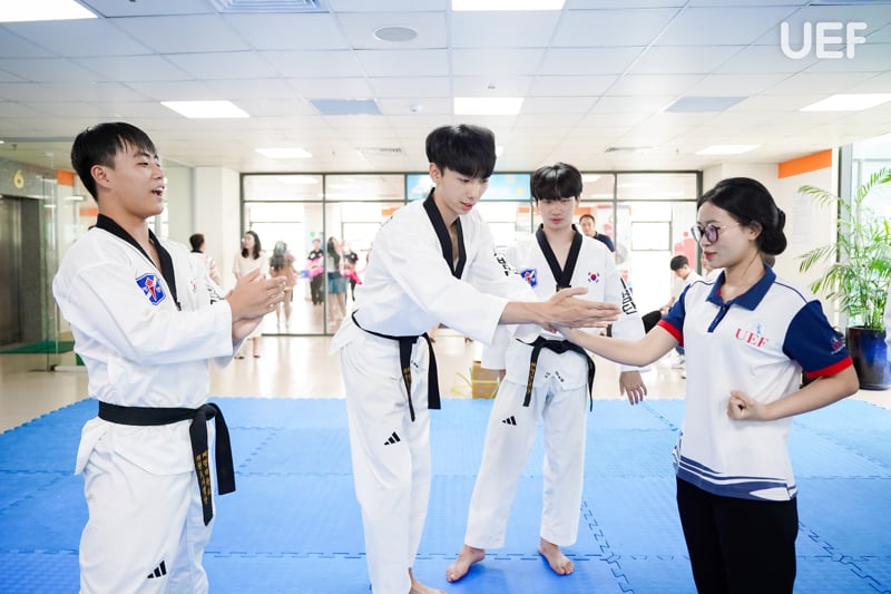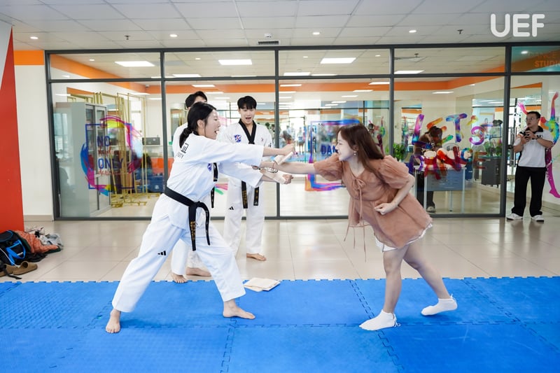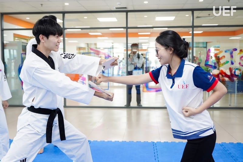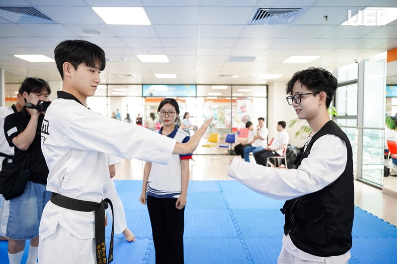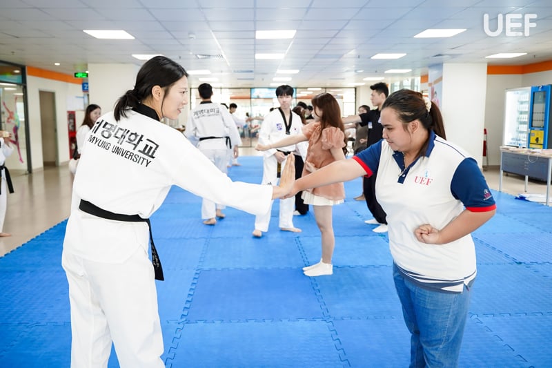 Mở đầu chương trình, các bạn sinh viên Đại học Keimyung đã mang đến màn giới thiệu và hướng dẫn trải nghiệm võ thuật Taekwondo, một trong những niềm tự hào của văn hóa Hàn Quốc. Qua đó, UEFers được làm quen với những động tác cơ bản, kỹ thuật phòng thủ và tấn công, đồng thời tìm hiểu ý nghĩa sâu xa về tinh thần thượng võ, kỷ luật và sự kiên trì mà Taekwondo đề cao. Không khí buổi giao lưu trở nên sôi động khi các bạn sinh viên hào hứng thử sức, tạo nên những khoảnh khắc vừa sôi nổi vừa gắn kết.