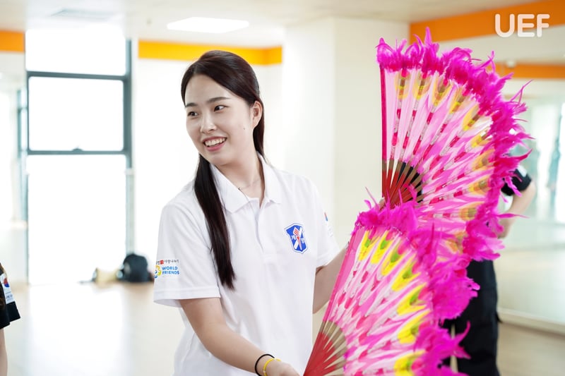 Tiếp nối chương trình là phần biểu diễn và trải nghiệm vũ đạo truyền thống Hàn Quốc. Các giảng viên và sinh viên Keimyung đã giới thiệu nét uyển chuyển, tinh tế của điệu múa truyền thống, đồng thời mời UEFers cùng tham gia các bước nhảy cơ bản. Sự hòa quyện giữa âm nhạc và động tác đã đem đến cho khán giả một bức tranh sống động về nghệ thuật dân gian Hàn Quốc, để lại nhiều ấn tượng đẹp trong lòng người tham dự.