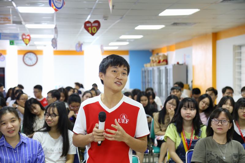 Thầy khéo léo truyền tải kiến thức thông qua những câu hội thoại quen thuộc, xen kẽ vào bài giảng những ví dụ hài hước, gần gũi. Buổi hội thảo nhanh chóng trở thành một buổi trò chuyện, giao lưu đầy thoải mái nhưng lại giúp các bạn sinh viên UEF tiếp thu kiến thức cực nhanh, cực hiệu quả.