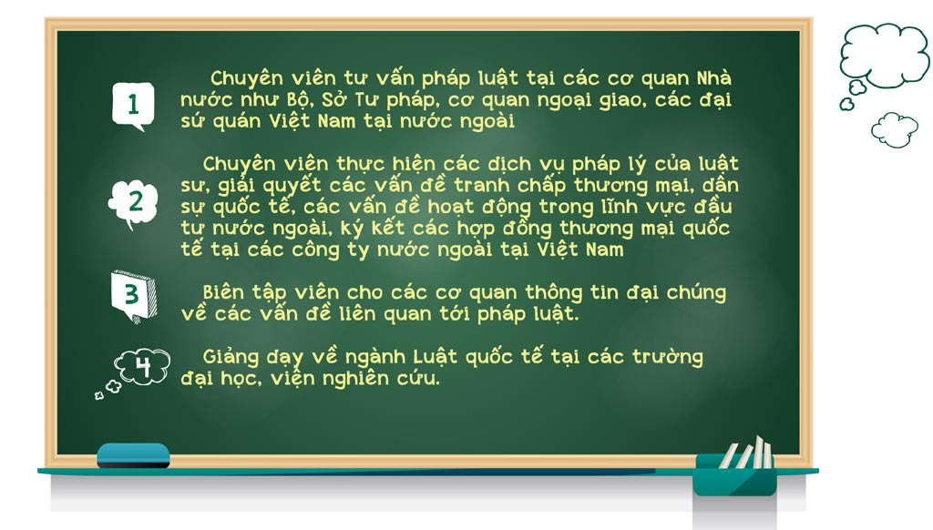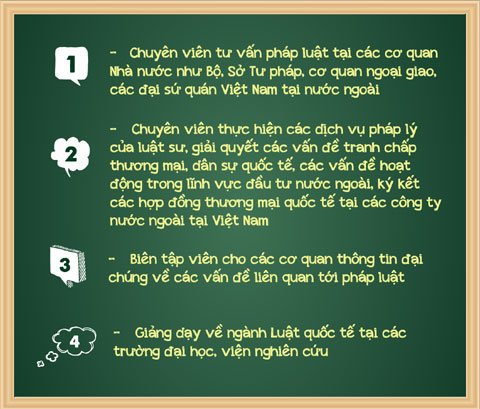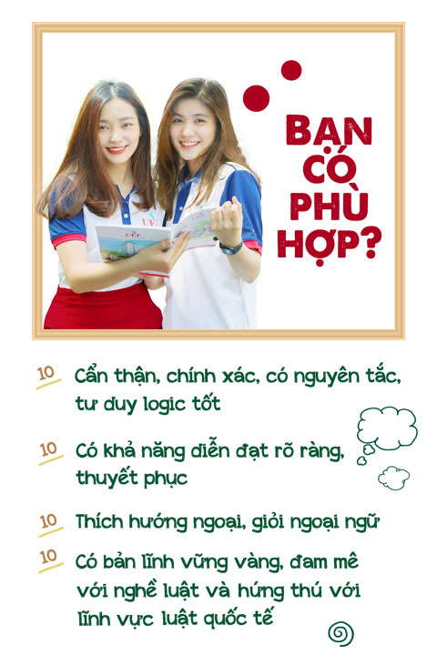 Các bạn sẽ được lĩnh hội kiến thức về pháp luật, kỹ năng thực tiễn trong lĩnh vực kinh doanh và ngoại giao cũng như khả năng nghiên cứu và xử lý tình huống.
