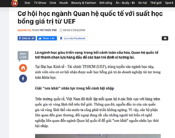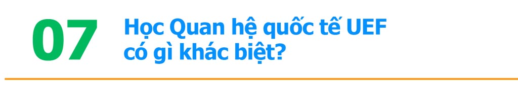 Chọn ngành Quan hệ quốc tế tại UEF là quyết định đúng đắn nhất của em. Tại đây, em được đào tạo kiến thức vững chắc cả về chính trị ngoại giao, văn hóa xã hội của các nước trên thế giới bằng tiếng Anh. Giảng viên luôn tận tình giúp đỡ, hỗ trợ để chúng em có thể tiếp thu kiến thức tốt nhất. Đặc biệt, em được thường xuyên được học tập với các Giáo sư đầu ngành và các buổi nói chuyện chuyên đề với các Giáo sư nước ngoài, cũng như được cập nhật tình hình thời sự và rèn luyện các kỹ năng cần thiết để trở thành một công dân toàn cầu.