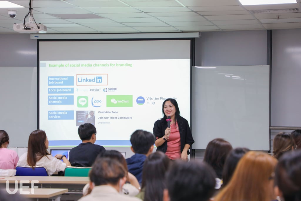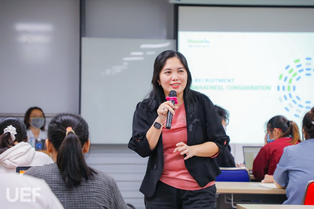 Ở chuyên đề Quản trị nguồn nhân lực (HRM) do chị Quách Bảo Trân - L&D Specialist Công ty Abbott Việt Nam - Cựu sinh viên UEF chia sẻ, diễn giả đã đưa ra những kiến thức cần thiết trong lĩnh vực nhân sự như mục đích, tầm quan trọng của quản trị nguồn nhân lực, các thành của HRM, quản lý thay đổi trong nguồn nhân lực, kỹ năng cần thiết trong lĩnh vực này và những chia sẻ từ thực tế của bản thân.