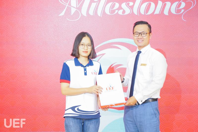 Trong buổi lễ, bạn Hồ Thị Lâm - tân sinh viên có thành tích xét tuyển đầu vào xuất sắc nhất của khoa đã được tuyên dương, khen thưởng. Thay mặt tập thể tân sinh viên khóa 2020, bạn đã gửi lời cảm ơn Nhà trường và chia sẻ cảm nhận về những ngày đầu học tập tại UEF.