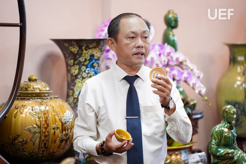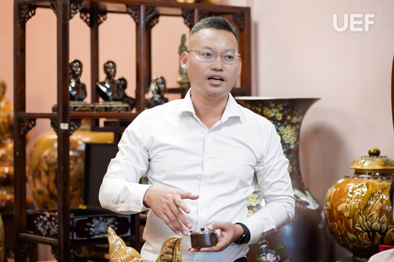 Bên cạnh đó, sinh viên được tìm hiểu những đặc trưng tiêu biểu của gốm Bát Tràng trong dòng chảy văn hóa dân tộc, từ tạo hình, hoa văn đến công năng sử dụng của từng sản phẩm. UEFers cũng được hướng dẫn phân biệt gốm, sành, sứ dựa trên màu sắc, nhiệt độ và thời gian nung, đồng thời tìm hiểu các phân khúc giá nhằm góp phần lan tỏa giá trị của gốm truyền thống đến đời sống của mỗi gia đình Việt.