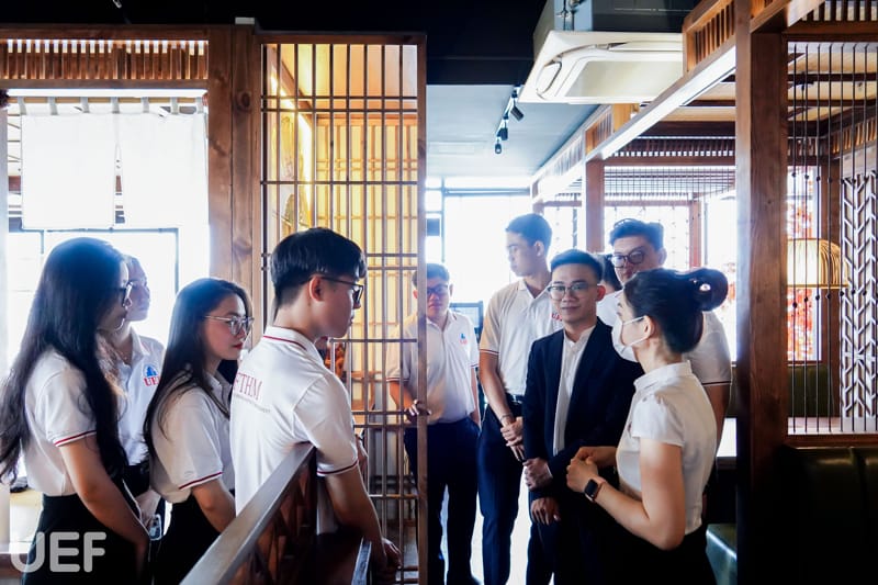 Tại đây, sinh viên đã được giới thiệu về các khu vực như bếp, phòng ăn Vip kín, phòng ăn mở, khu chế biến sushi,... Bên cạnh đó, các bạn còn được hướng dẫn và chia sẻ về văn hóa dịch vụ của nhà hàng Nhật, đó chính là tinh thần Omotenashi trong văn hóa Nhật Bản - phục vụ bằng trái tim, phục vụ vượt sự mong đợi của khách hàng và mang lại giá trị cho cộng đồng.