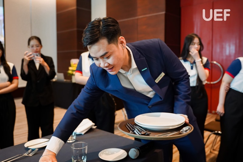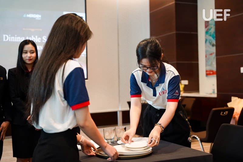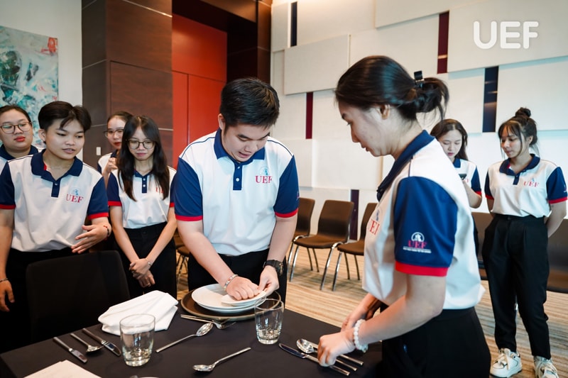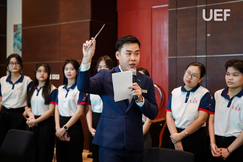 Nhân viên khách sạn giới thiệu thông tin tập đoàn và hướng dẫn tận tình cho sinh viên UEF về nghiệp vụ F&B