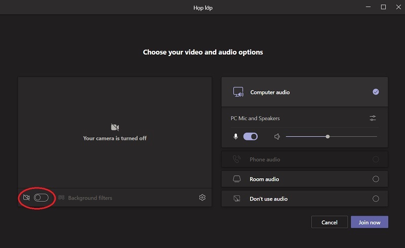 - Kiểm tra thiết bị âm thanh, hình ảnh trước khi tham gia Meeting -> Join Now