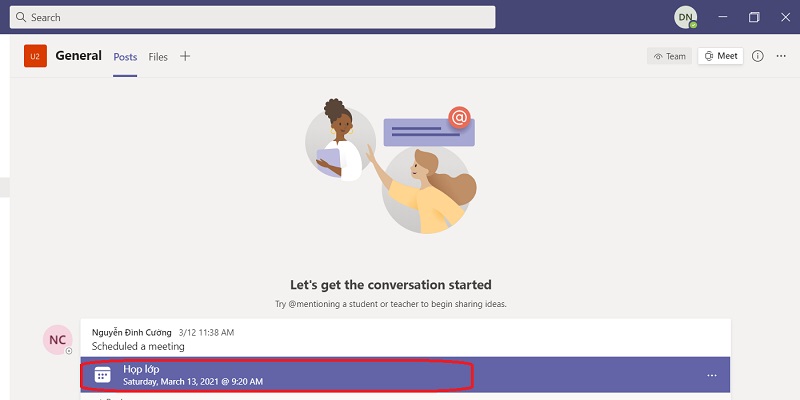 - Phần nội dung tô màu xanh đậm cho biết đó là hoạt động Meeting Online. Click vào để tham gia Meeting online