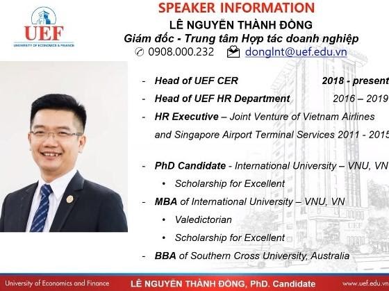 Diễn giả chia sẻ trong chương trình kỳ này là ThS. Lê Nguyễn Thành Đồng – Giám đốc Trung tâm Hợp tác doanh nghiệp UEF.