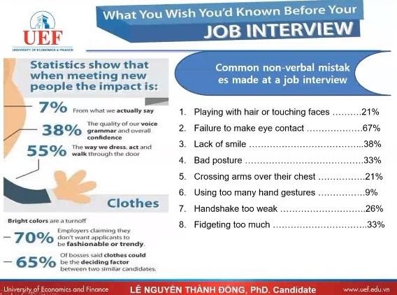 Một số hạn chế mà đa phần những bạn thường mắc phải khi đi phỏng vấn cũng được đề cập đến như: không chuẩn bị trước, trang phục không phù hợp, trễ giờ, tư thế ngồi, kỹ năng nghe kém, không tỏ ra hứng thú khi nghe phỏng vấn, diễn đạt dài dòng, lan man, sử dụng điện thoại,…