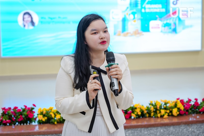 Thông qua các case study thực tế về ứng dụng AI trong thương mại điện tử, bà Phạm Thu Ngân giúp sinh viên hiểu rõ hơn về cách công nghệ đang thay đổi toàn bộ chuỗi vận hành của ngành. Từ đó, diễn giả giới thiệu “bản đồ ngành thương mại điện tử trong thời đại AI”, chỉ ra những vị trí nghề nghiệp tiềm năng như quản lý sàn thương mại điện tử, phân tích dữ liệu kinh doanh, digital marketing, quản lý vận hành nền tảng và phát triển sản phẩm số. Bên cạnh kiến thức chuyên môn, sinh viên được khuyến khích phát triển các năng lực cốt lõi như tư duy dữ liệu, khả năng thích ứng công nghệ mới, sáng tạo nội dung và kỹ năng phân tích hành vi người dùng.