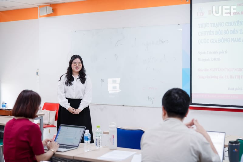 Ở góc độ tài chính hành vi và phát triển bền vững, bạn Tạ Diễm My trình bày đề tài “Các nhân tố ảnh hưởng đến hành vi không tiền mặt của Gen Z tại TP.HCM”; bạn Võ Khắc Mỹ Duyên nghiên cứu “Đánh giá thực trạng triển khai tín dụng xanh và các rào cản tiếp cận vốn đối với khách hàng cá nhân tại Ngân hàng TMCP Quân đội (MB Bank)”; bạn Nguyễn Nữ Như Ngọc với đề tài “Thực trạng chuyển đổi số và tác động của chuyển đổi số tới tăng trưởng kinh tế tại các quốc gia Đông Nam Á”.