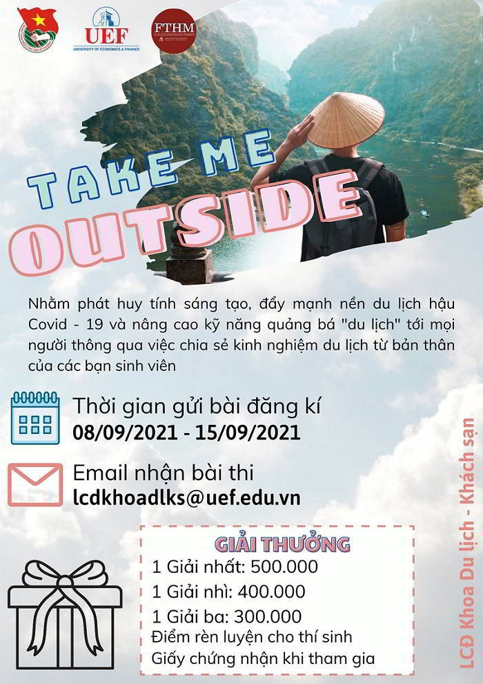 Đây là sân chơi do Liên Chi đoàn khoa Quản trị Du lịch – Khách sạn tổ chức từ 8/9 đến 24/9. Cuộc thi sẽ dẫn dắt các bạn sinh viên đến những chân trời mới qua hình thức review điểm du lịch từng trải nghiệm. Take Me Outside sẽ tạo cơ hội cho các thành viên Nhà UEF giao lưu, học hỏi, trau dồi kiến thức liên quan đến du lịch, được thưởng thức vẻ đẹp của các địa danh nổi tiếng và các địa điểm du lịch tuyệt vời thông qua các chia sẻ từ bản thân những người đã từng “vi vu”, bởi trong bối cảnh hiện tại, việc trực tiếp tận hưởng là điều không thể!