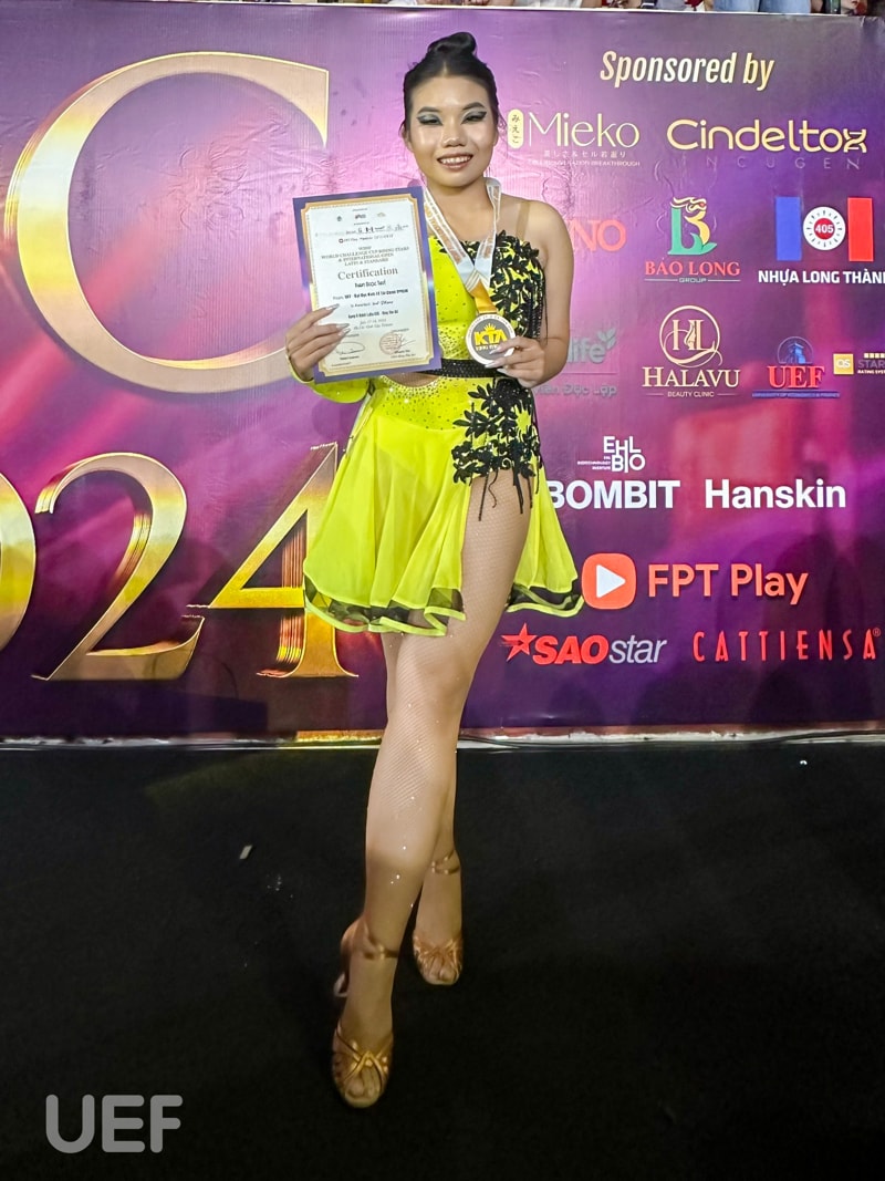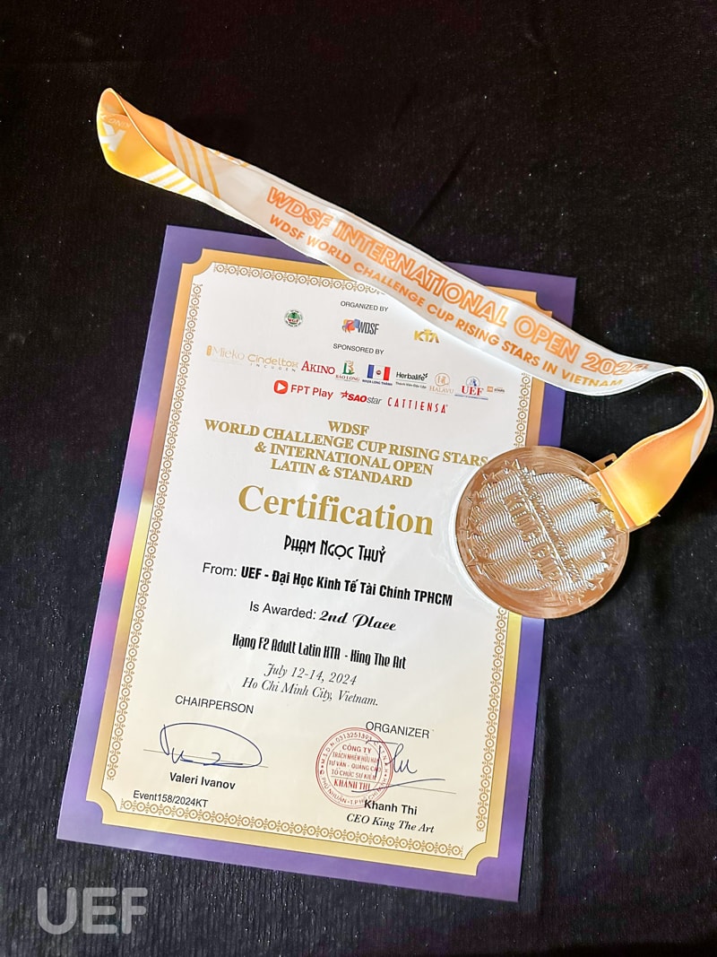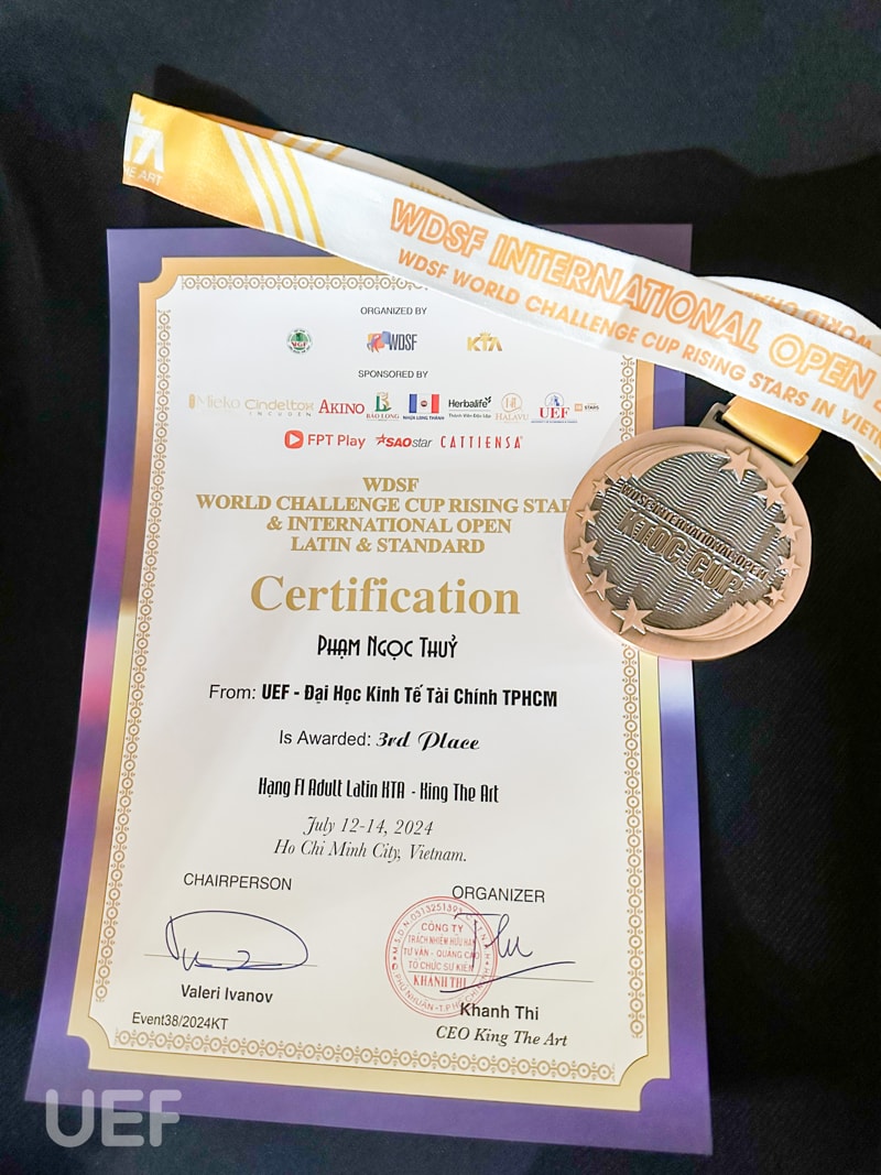 20 vận động viên của trường đã có dịp tỏa sáng tài năng ở giải đấu tầm cỡ quốc tế và xuất sắc đạt Huy chương Bạc ở tiết mục đồng diễn tập thể tại đấu trường chuyên nghiệp này. Cũng trong khuôn khổ buổi thi đấu, ở hạng mục cá nhân, bạn Phạm Ngọc Thủy - sinh viên năm hai Khoa Quan hệ quốc tế UEF đã xuất sắc đạt Huy chương Đồng, hạng F1 Adult Latin KTA - King The Art và Huy chương Bạc, hạng F2 Adult Latin KTA - King The Art.