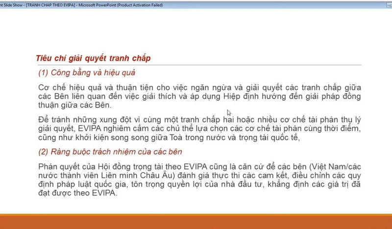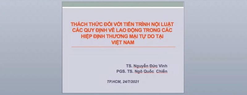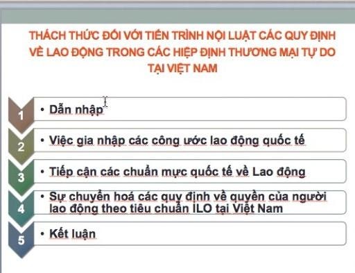 Trong phần báo cáo tham luận của các thầy cô, nhiều vấn đề đã được đưa ra như: Khái quát hệ thống luật liên quan, chuyển hóa ILO vào hệ thống luật Việt Nam, trách nhiệm xã hội của các doanh nghiệp, giải quyết tranh chấp giữa 2 hiệp định, phương thức giải quyết, luật áp dụng và cơ chế để giải quyết, thực trạng pháp luật và thực thi pháp luật sở hữu trí tuệ ở Việt Nam, hoàn thiện luật sở hữu trí tuệ khi Việt Nam ký kết hiệp định thương mại tự do Việt Nam – EU,…