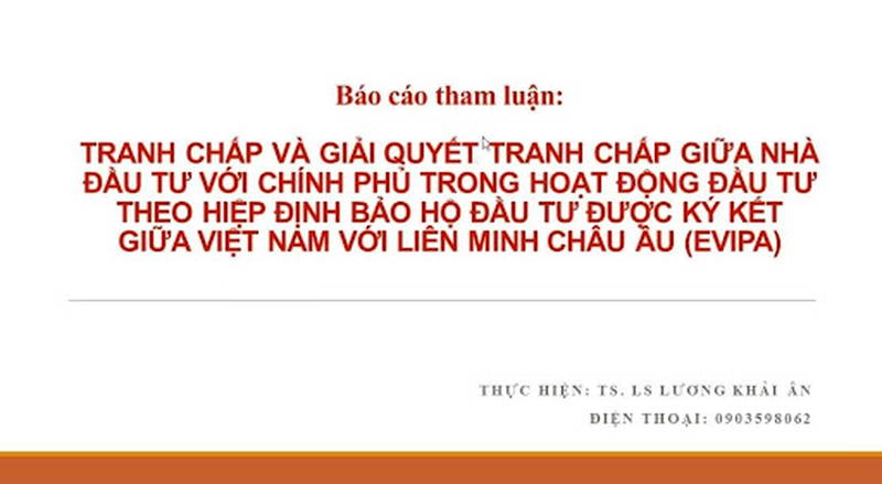 Hội thảo diễn ra với 4 tham luận được trình bày, bao gồm: "Thách thức đối với tiến trình nội lực các quy định về lao động trong các hiệp định thương mại tự do Việt Nam" do TS. Nguyễn Đức Vinh – Đại học Ngoại Thương báo cáo; "Tranh chấp và giải quyết tranh chấp giữa nhà đầu tư với Chính phủ trong hoạt động đầu tư theo hiệp định bảo hộ đầu tư được ký kết giữa Việt Nam và Liên minh Châu Âu (EVIPA)" của Tiến sĩ – Luật sư Lương Khải Ân; "Hiệp định thương mại tự do Việt Nam – EU (EVFTA) tác động tới việc hoàn thiện pháp luật sở hữu trí tuệ Việt Nam" của TS. Nguyễn Ngọc Anh Đào – Trường Đại học Ngân Hàng; "Fundamental Breach to Avoid The Contract Under CISG 1980" do ThS. Phó Hưng Bình – Giảng viên khoa Luật UEF trình bày.
