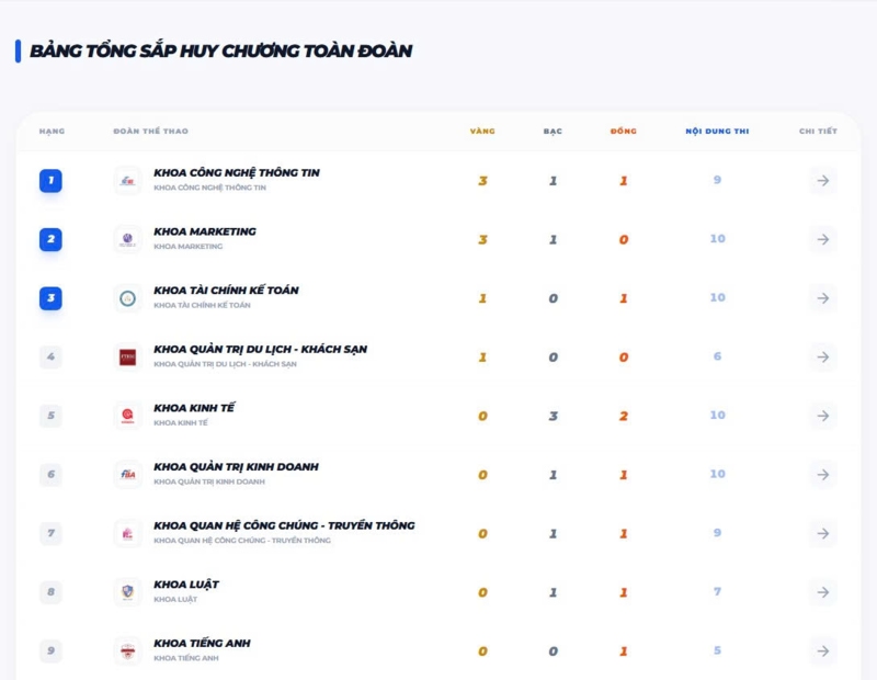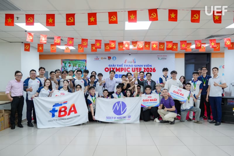 Bên cạnh những kết quả nổi bật ở các môn thi đấu, bảng tổng sắp huy chương toàn đoàn Olympic UEF 2026 cũng đã có những chuyển biến đáng chú ý. Hiện tại, Khoa Công nghệ thông tin đang tạm dẫn đầu với 3 huy chương Vàng, 1 Bạc và 1 Đồng. Bám sát phía sau là Khoa Marketing với cùng 3 huy chương Vàng nhưng ít hơn về số huy chương phụ, tạm xếp vị trí thứ hai. Khoa Tài chính - Kế toán vươn lên đứng thứ ba với 1 huy chương Vàng và 1 huy chương Đồng, trong khi các đơn vị như Khoa Quản trị du lịch - Khách sạn, Khoa Kinh tế hay Khoa Quản trị kinh doanh cũng đang tích cực bám đuổi. Cuộc đua toàn đoàn hứa hẹn sẽ còn nhiều biến động khi các môn thi đấu tiếp theo của mùa giải đang bước vào giai đoạn quyết định.