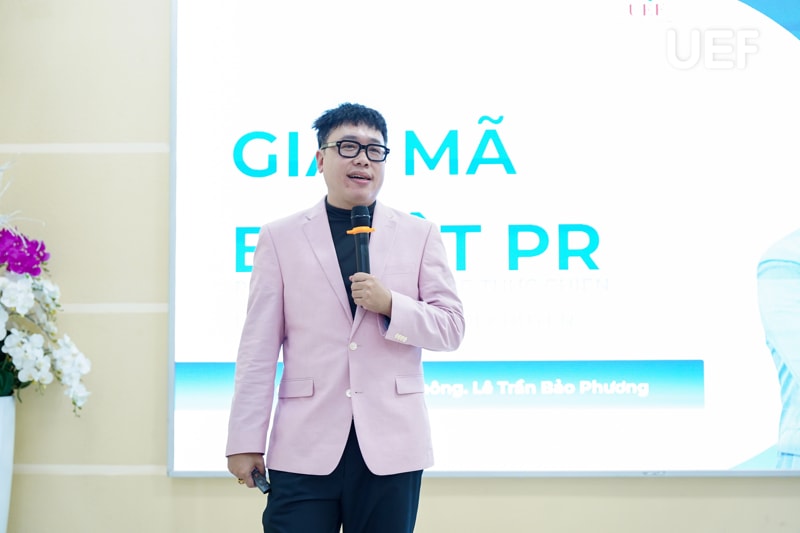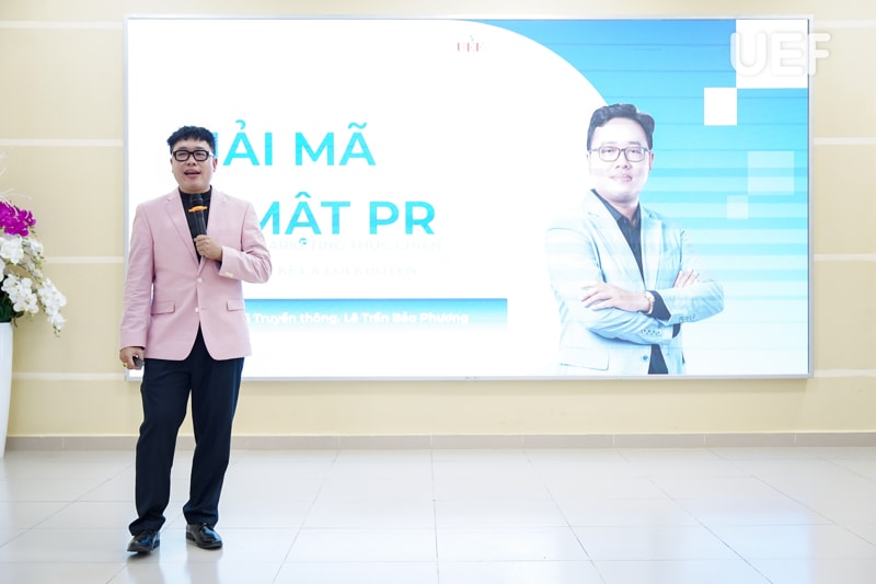 PR - Public Relations là lĩnh vực chuyên quản lý hình ảnh, mối quan hệ giữa tổ chức hoặc cá nhân với công chúng, thông qua các hoạt động truyền thông chiến lược. PR tập trung xây dựng lòng tin, tạo dựng hình ảnh tích cực và quản lý thông tin để duy trì sự ủng hộ từ các bên liên quan. Khởi động buổi chia sẻ, diễn giả Bảo Phương giúp các sinh viên điểm lại những kiến thức cơ bản trong ngành tại các bộ phận như: Client, Consumer, Marketing, Communication, Advertising,... Diễn giả đánh giá cao khi sinh viên tại UEF có tinh thần học hỏi, nền tảng kiến thức ngành vững vàng.