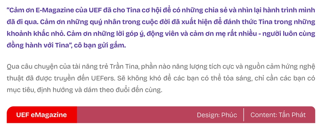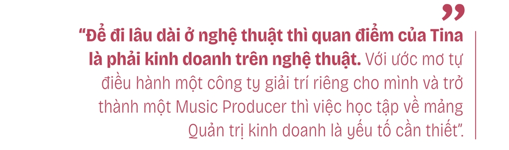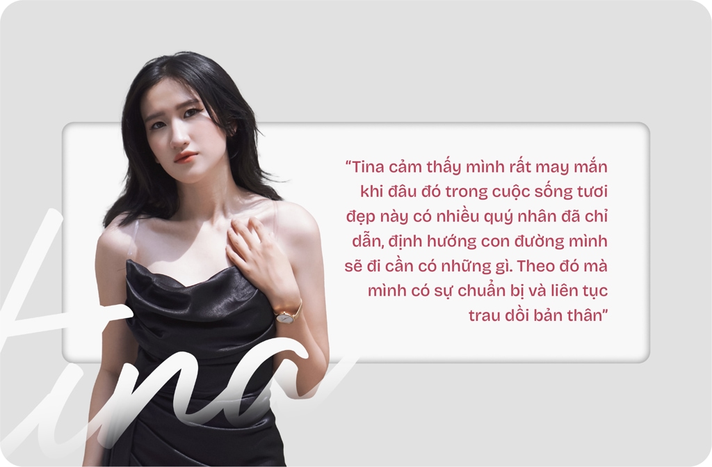 ![]() Tina tâm sự: “Niềm đam mê có sẵn trong máu của mình luôn thôi thúc bản thân cố gắng mỗi ngày. May mắn hơn là xung quanh Tina luôn có những anh, chị, em, bạn bè đưa ra rất nhiều lời khuyên và góp ý cho con đường Tina đang lựa chọn để không bị cuốn theo bản ngã. Đặc biệt là mẹ - người luôn ủng hộ con gái từ những bước chập chững đến hôm nay”.
