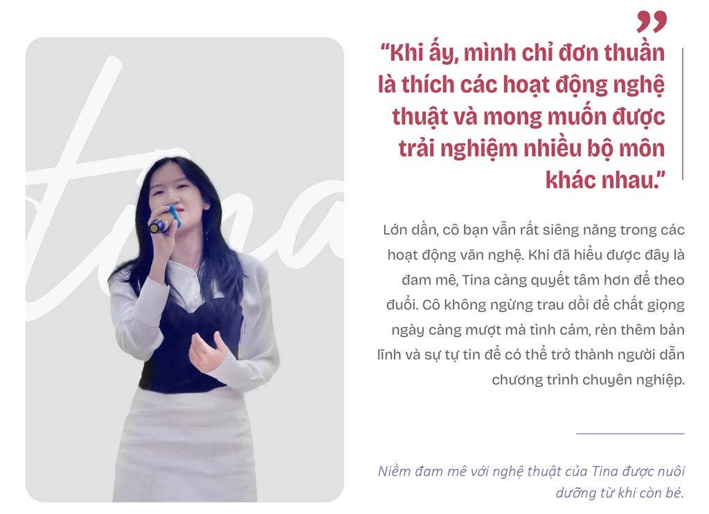 ![]() ![]() Từ nhỏ, Tina đã có niềm yêu thích với ca hát. Cô bạn rất năng nổ trong các giải văn nghệ tại trường, lớp. Cũng vì thế mà sở thích ấy được hun đúc dần thành đam mê và ước mơ của Tina. Không chỉ có ca hát, từ những năm cấp một, nữ sinh cũng đã theo chân các anh chị vào nhà thiếu nhi tại địa phương để được học làm người mẫu nhí, nhảy múa, MC,...