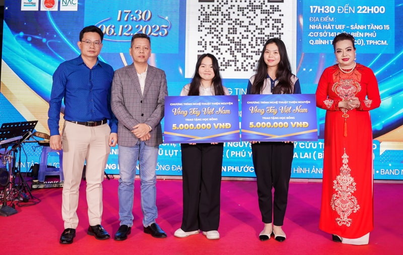Trong khuôn khổ chương trình, Ban tổ chức đã trao 02 suất học bổng, mỗi suất trị giá 5 triệu đồng đến hai sinh viên UEF quê Phú Yên bị ảnh hưởng nặng nề bởi thiên tai: sinh viên Kim Lê Khánh Ngọc (ngành Kinh doanh quốc tế) và sinh viên Võ Mạnh Tâm Nhi (ngành Luật). Khoảnh khắc đó không chỉ là sự hỗ trợ về vật chất mà còn là lời động viên tinh thần sâu sắc, tiếp thêm niềm tin để các bạn vững bước trong học tập và cuộc sống.