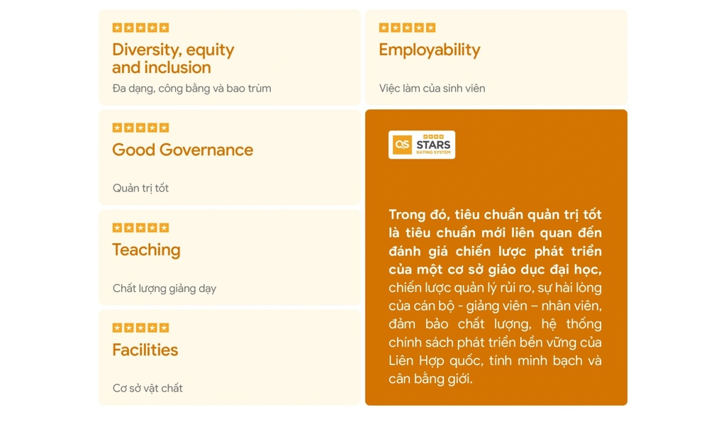Bên cạnh đó, điểm nổi bật làm nên thế mạnh đào tạo của trường là đa dạng chương trình quốc tế từ trao đổi sinh viên, học kỳ quốc tế đến chương trình liên kết. Sinh viên có nhiều cơ hội học tập tại Việt Nam hoặc chuyển tiếp 2+2 hoặc 3+1 ở các trường nước ngoài mà trường hợp tác để nhận bằng quốc tế. ![]() Trong chu kỳ đánh giá năm 2024, QS bổ sung tiêu chuẩn đa dạng, công bằng và bao trùm thay cho tiêu chuẩn Phát triển toàn diện để đánh giá một trường đại học trong việc cung cấp môi trường học tập công bằng và quan tâm sự phát triển của mỗi cá nhân, tôn trọng sự khác biệt và tự do thể hiện.