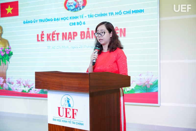 Lễ kết nạp Đảng viên Chi bộ 6 được tổ chức trong không khí trang nghiêm, đúng quy định. Tại buổi lễ, đồng chí Trần Ngọc Diễm Minh - Bí thư Chi bộ 6 đã công bố quyết định kết nạp Đảng viên cho quần chúng ưu tú Nguyễn Ngô Anh Thư (Khoa Tài chính - Kế toán). Đồng chí Bùi Quang Đông - Chi ủy viên đã đại diện Đảng ủy trường đã trao quyết định.