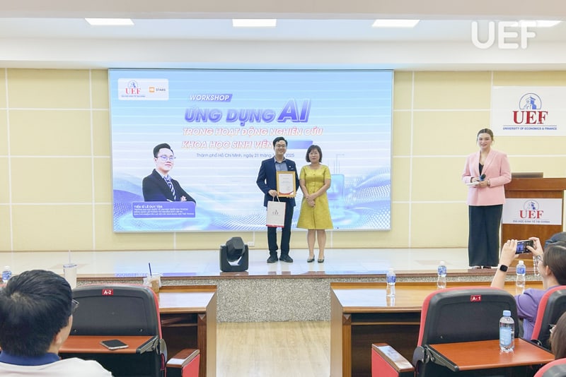 Tại workshop, TS. Lê Duy Tân đã thổi “một làn gió mới” vào thế giới nghiên cứu khoa học của sinh viên UEF, bằng những chia sẻ đầy tâm huyết về ứng dụng AI. Không chỉ là những kiến thức khô khan, diễn giả còn truyền tải cảm hứng khám phá và sáng tạo, giúp sinh viên nhận ra tiềm năng vô hạn của AI trong hành trình chinh phục tri thức.