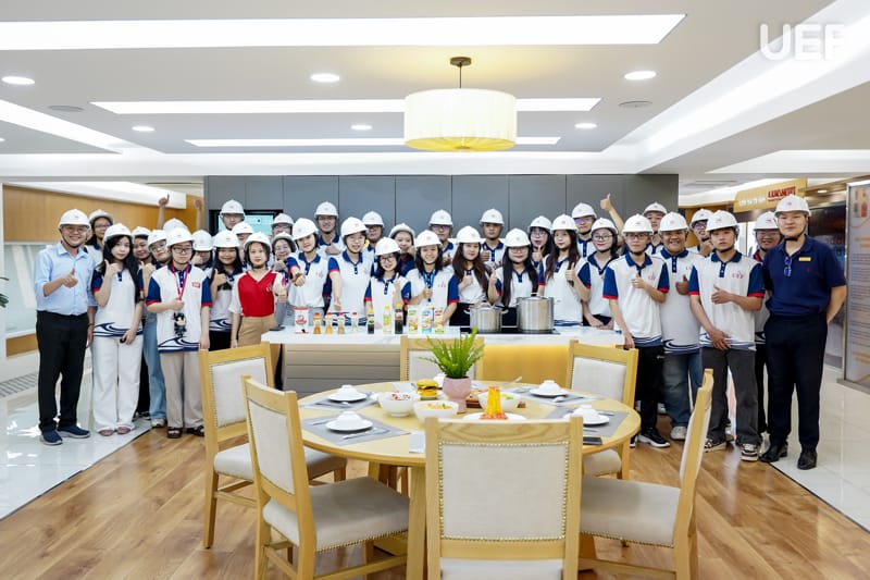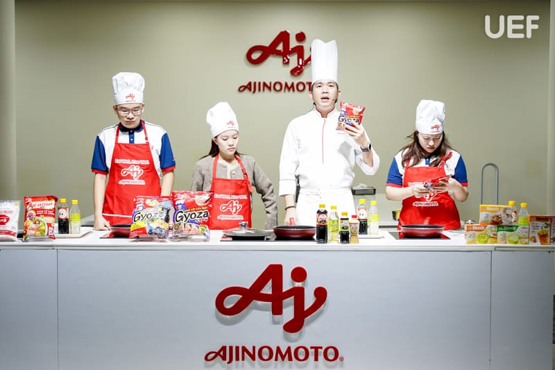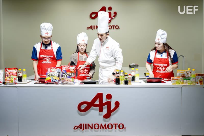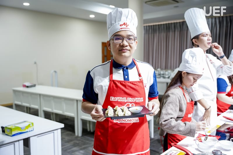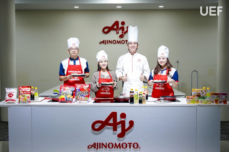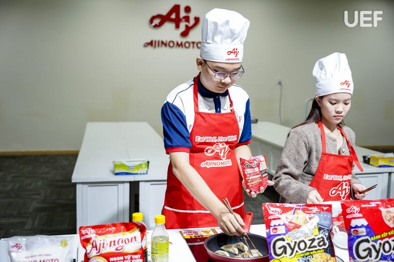 Bên cạnh kiến thức kỹ thuật và quy trình sản xuất, Ajinomoto còn mang đến cho UEFers một trải nghiệm vô cùng thú vị: nấu ăn trực tiếp với đầu bếp của công ty. Sinh viên được hướng dẫn thực hiện và thưởng thức các món: bánh xếp kiểu Nhật (Gyoza); cơm cuộn chấm sốt mè rang “Aji-xốt”; trà đào cam sả Blendy. Hoạt động mang lại bầu không khí vừa học tập vừa giải trí, giúp sinh viên hiểu rõ hơn cách ứng dụng sản phẩm Ajinomoto trong ẩm thực gia đình và nhà hàng. Nhiều bạn chia sẻ rằng đây là trải nghiệm “đáng nhớ nhất” vì được quan sát và tự tay thực hành, cảm nhận sự tỉ mỉ và tiêu chuẩn cao trong văn hóa ẩm thực Nhật Bản.