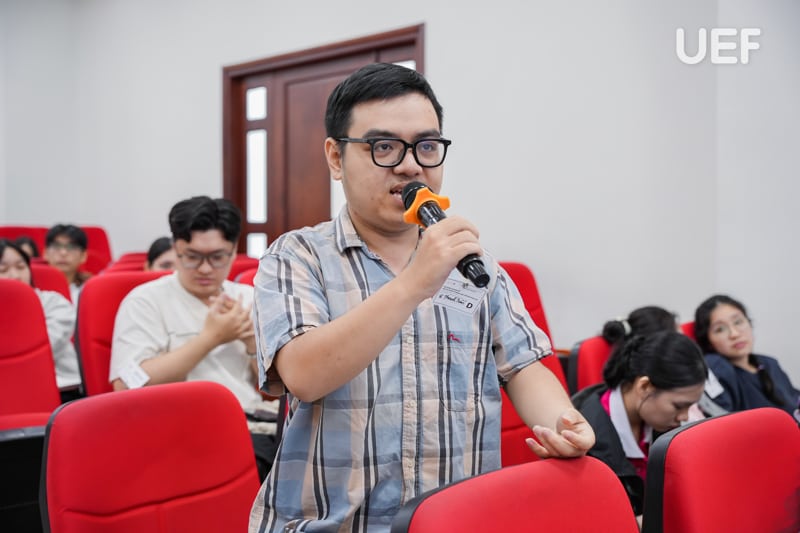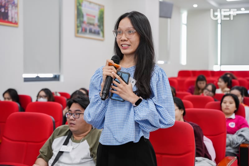 Trong suốt chương trình, UEFers tích cực đặt câu hỏi trao đổi với diễn giả về các vấn đề liên quan đến hợp tác và ngoại giao quốc tế, góp phần tạo nên không khí học thuật sôi nổi. Những chia sẻ chuyên môn được giải đáp trực tiếp, giúp sinh viên có cơ hội tiếp cận nhiều góc nhìn thực tiễn, hiểu sâu về bối cảnh hoạt động đối ngoại và nắm các tiêu chí năng lực của ngành. Từ đó, giúp sinh viên dễ dàng xác định rõ hướng đi và xây dựng lộ trình học tập phù hợp để phát triển bản thân.