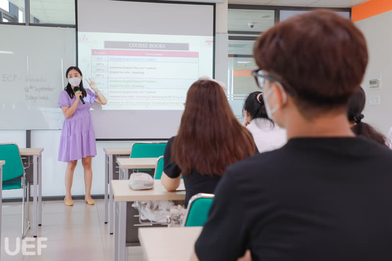 Tại lớp học này, các bạn tân sinh viên UEF sẽ được ôn tập và trau dồi thêm các kiến thức tiếng Anh cần thiết từ ngữ pháp đến các kĩ năng như nghe, nói, đọc, viết,... Trong không khí học tập năng động, gần gũi, mỗi lớp có sĩ số từ 32 - 35 sinh viên, giúp các bạn dễ dàng trao đổi, làm bài tập nhóm, từ đó đạt được hiệu quả cao trong học tập.