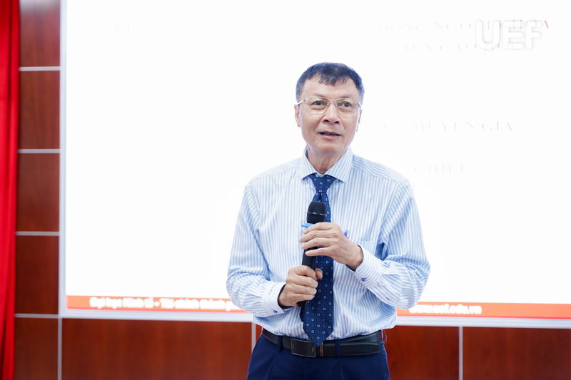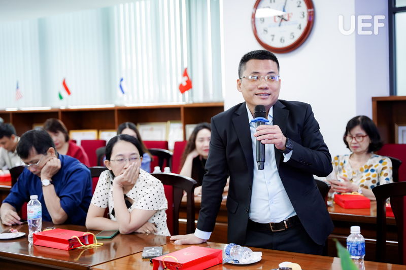 TS. Ngô Minh Hải thay mặt Nhà trường gửi lời tri ân chân thành đến tất cả các thầy, cô tham gia vào công tác đào tạo thạc sĩ, tiến sĩ suốt nhiều năm qua. Thầy đặc biệt nhấn mạnh đến vai trò của nhà giáo trong bối cảnh hiện đại, không chỉ là hướng dẫn chia sẻ mà còn mang tính đồng hành. Chính nhờ sự nhiệt huyết và yêu nghề của thầy, cô mà đều đặn mỗi năm học, UEF có thể đào tạo ra những thạc sĩ, tiến sĩ chất lượng cao, có năng lực và tầm nhìn, cống hiến nhiều hơn cho xã hội.
