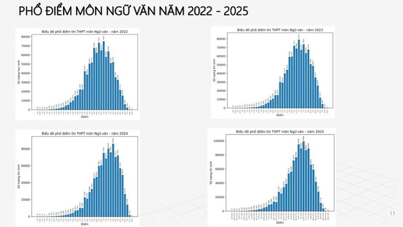 Phổ điểm môn Ngữ văn năm 2025 cho thấy phổ phân bố lệch phải, tập trung nhiều ở khoảng điểm từ 6,0 đến 7,5. Cụ thể, điểm số có số lượng thí sinh đạt cao nhất là 6,75 điểm với 95.188 thí sinh, theo sau là 7,0 điểm (91.468 thí sinh) và 6,5 điểm (89.360 thí sinh). Điều này cho thấy phần lớn học sinh đạt mức điểm trung bình – khá. Không nhiều thí sinh đạt điểm cao vượt trội (9 điểm trở lên), thể hiện tính phân loại vẫn được đảm bảo.
