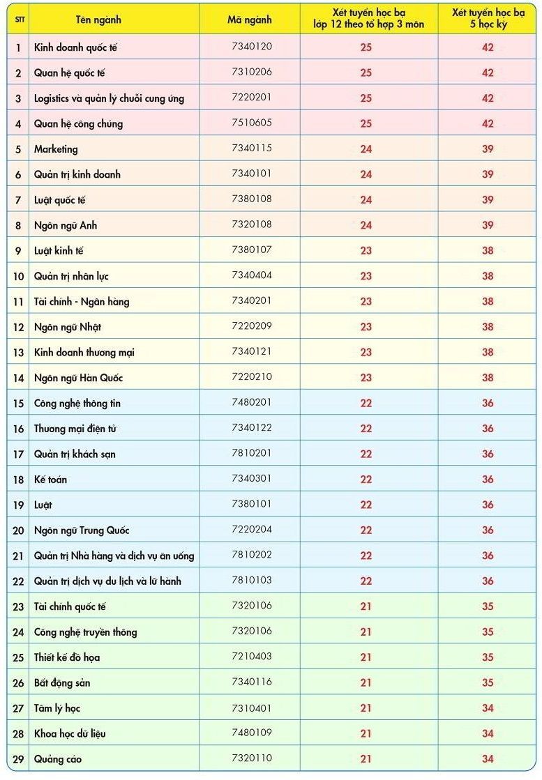 Các ngành Kinh doanh quốc tế, Quan hệ quốc tế, Logistics và quản lý chuỗi cung ứng, Quan hệ công chúng có sự dao động lớn nhất là 7 điểm đối với phương thức xét tuyển lớp 12 ( từ 18 đến 25 điểm) và 12 điểm đối với phương thức xét học bạ 5 học kỳ (từ 30 đến 42 điểm).